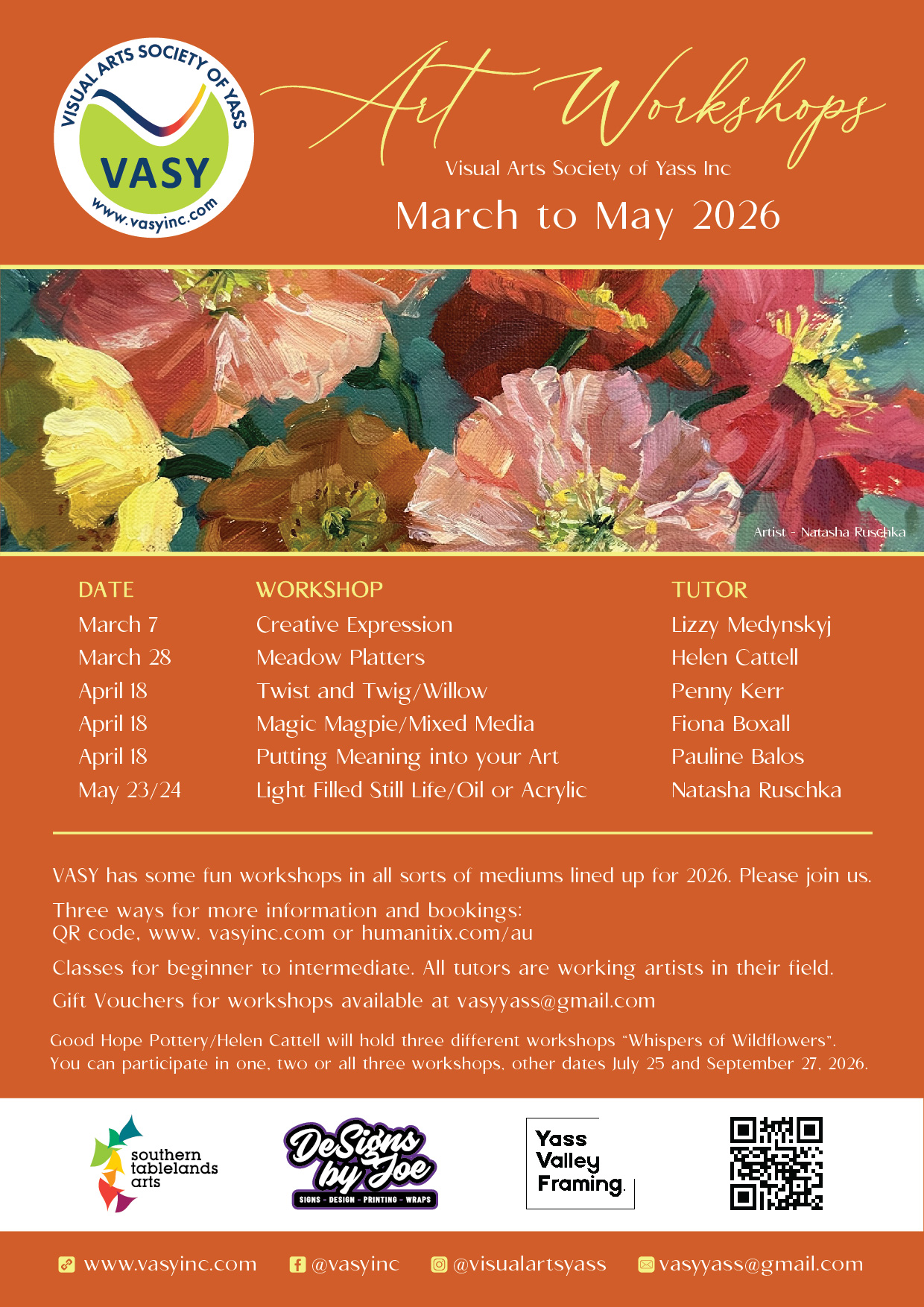 The Visual Art Society of Yass has some fun workshops lined up for March, April and May.